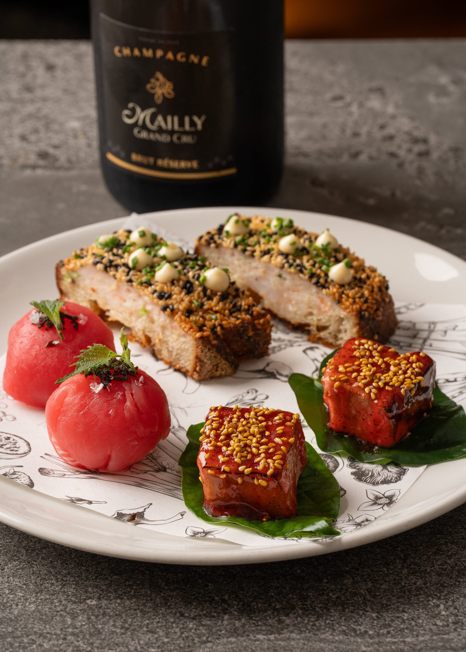 Lemon myrtle glazed pork belly, yuzu, sesame, betel leaf